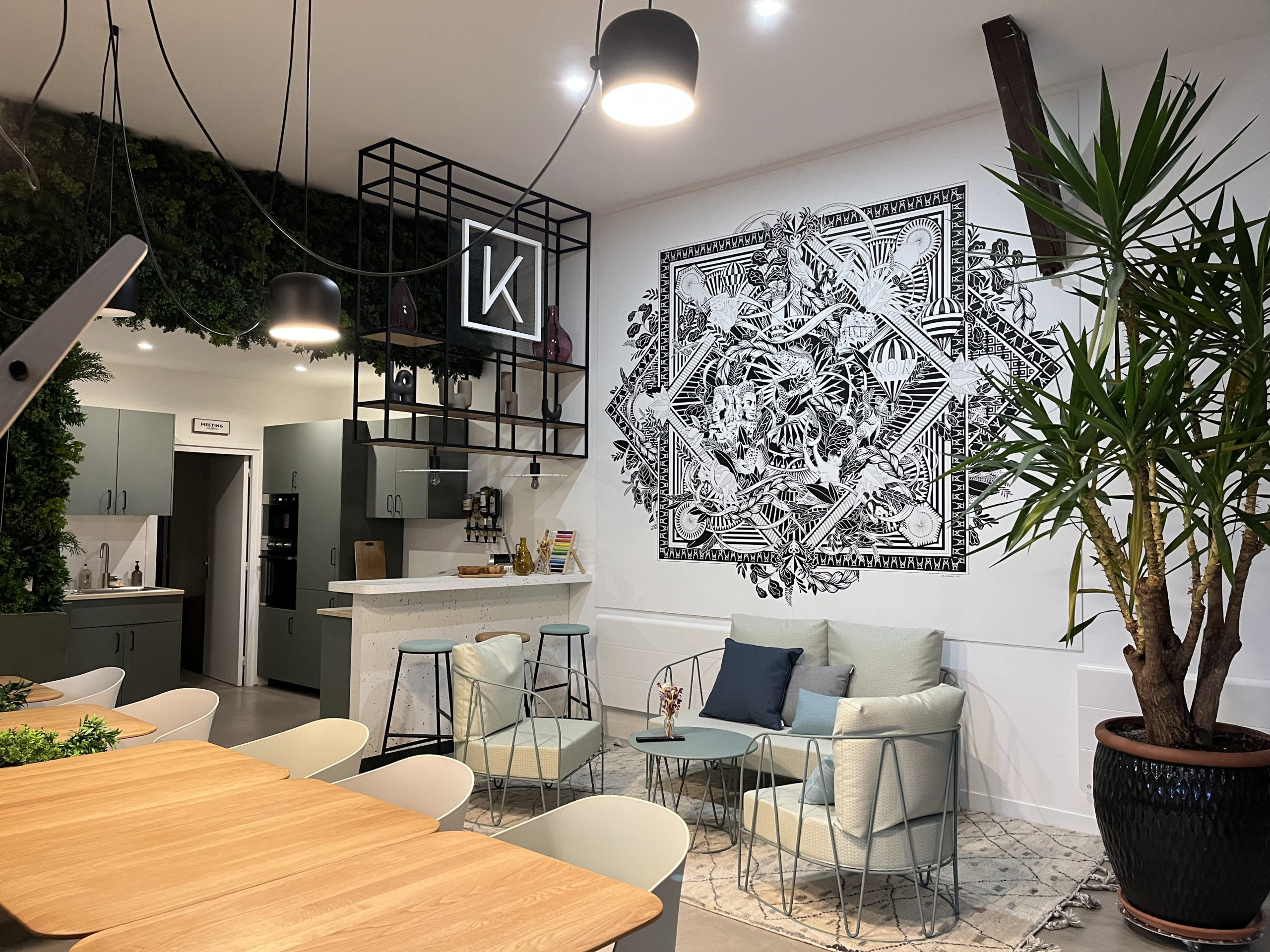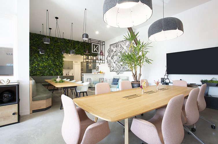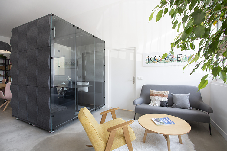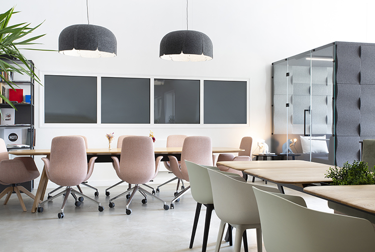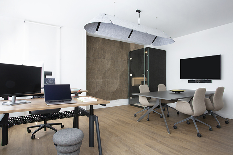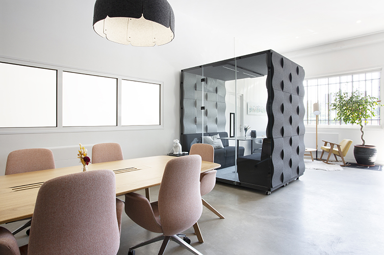 Design et aménagement d'un espace de travail collaboratif, de bureaux, d'un espace de détente et de cabines acoustiques.